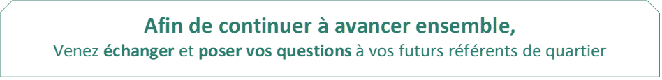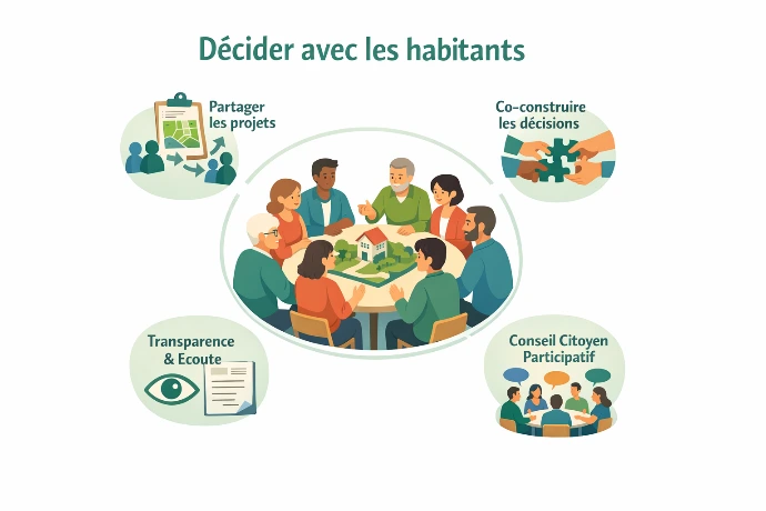 Partager les projets en amont avec les habitants, co-construire les décisions importantes, garantir la transparence, l'écoute et le respect de chacun, mettre en place un Conseil citoyen participatif, ouvert à toutes et tous